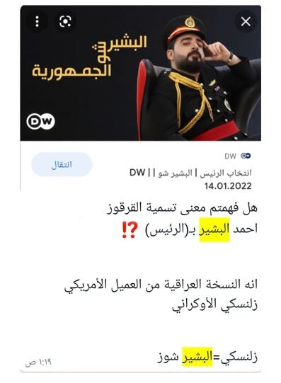 احمد البشیر همانند نسخه طنز «خادم ملت» ولادیمیر زلنسکی که او را متعاقبا به کرسی ریاست جمهوری در اوکراین رساند، تلاش می کند در شمایل یک رییس جمهور با لباس نظامی ظاهر می شود و بر برنامه خود نام «جمهوری بشیر» نهاده است.