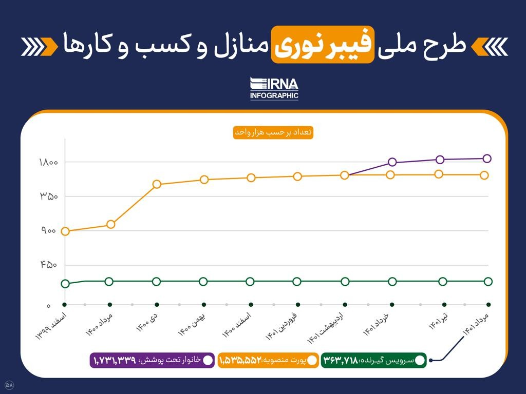 بر اساس آخرین گزارش سامانه «شبکه دسترسی به فیبرنوری»، از زمان آغاز به کار دولت ابراهیم رئیسی در مرداد ۱۴۰۰ تا مرداد ۱۴۰۱ تعداد خانوارها و کسبوکارهای تحت پوشش طرح ملی فیبرنوری از یک میلیون و ۹۰۹،۰۶۸ به ۱،۷۳۱،۳۳۹ رسیدهاست. به عبارتی تعداد خانوارهایی که از ابتدای مرداد پارسال تا مرداد امسال تحت پوشش طرح ملی فیبرنوری قرار گرفتهاند برابر است با ۸۲۲،۲۷۱ خانوار.