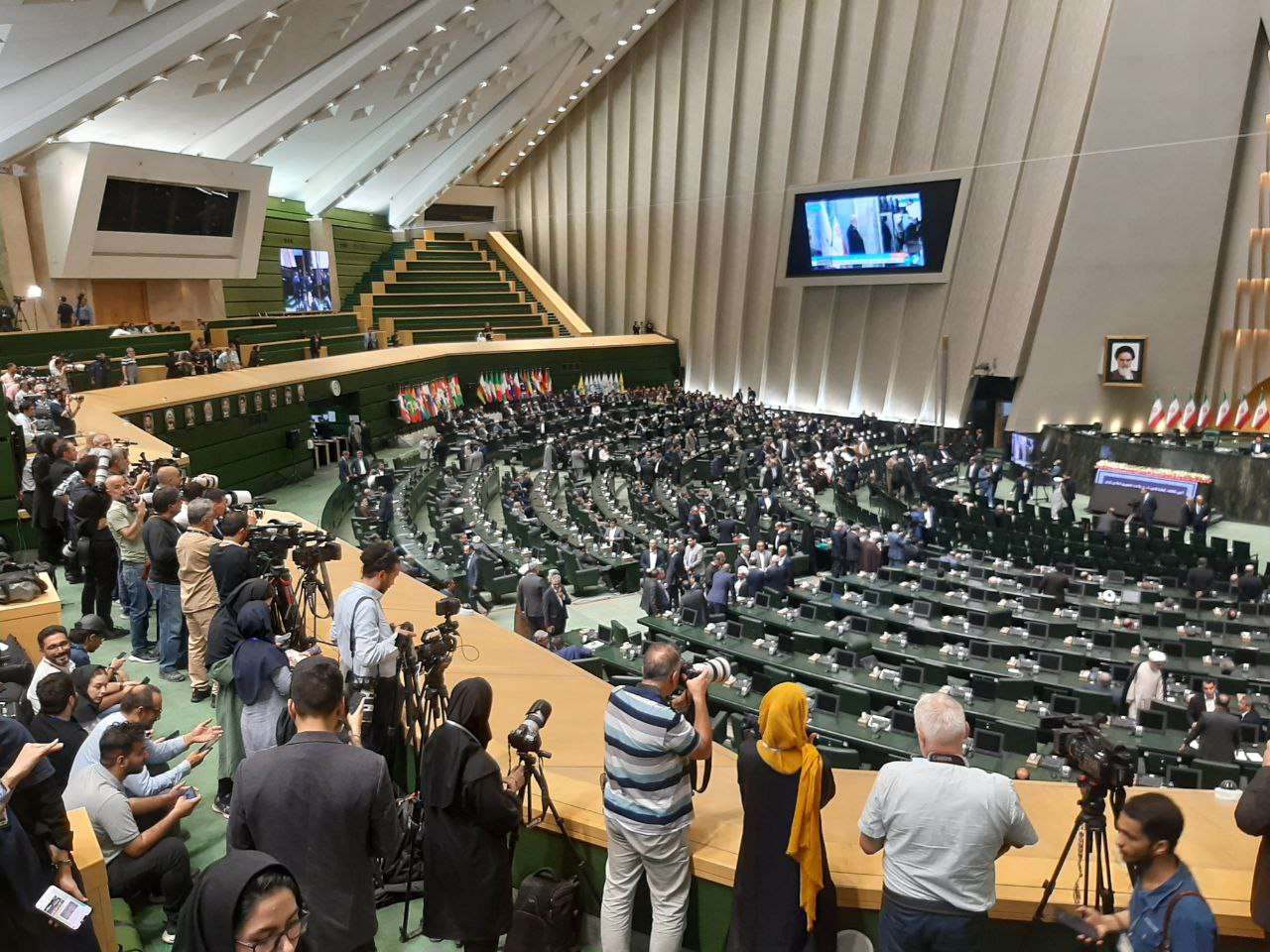 ـ سرانجام ساعت ۱۴ و ۳۸دقیقه دربهای مجلس شورای اسلامی به روی خبرنگاران باز شد. حدود ۶۰۰ خبرنگار داخلی و خارجی برای پوشش این مراسم حضور دارند و هیاتهای پارلمانی نیز به تدریج وارد مجلس میشوند.