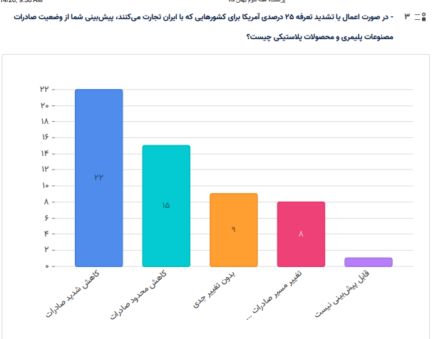 در بخش مربوط به احتمال اعمال یا تشدید تعرفه ۲۵ درصدی آمریکا برای کشورهایی که با ایران تجارت میکنند، اکثریت قاطع فعالان صنعت پلیمر، سناریوی تعرفهای را تهدیدی جدی برای صادرات مصنوعات پلیمری و محصولات پلاستیکی میدانند. در واقع، برخلاف خوشبینی محتاطانه نسبت به مذاکرات، در حوزه تعرفهها نگرانی بسیار پررنگتر است.